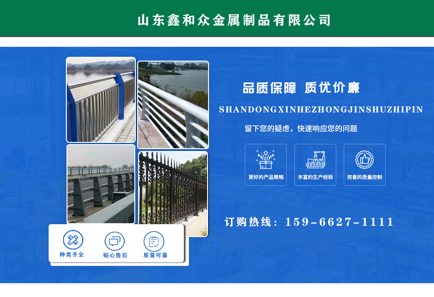山东鑫和众金属制品有限公司主要产品有防撞护栏,桥梁护栏,道路护栏,河道护栏,不锈钢护栏等护栏。提供设计方案,一站式定制,包您满意价格优惠,欢迎来电咨询! 公司常年从事销售护栏防撞护栏,桥梁护栏,道路护栏,河道护栏,不锈钢护栏,桥梁钢护栏,河道灯光护栏等。产品广泛应用于桥梁、河道、旅游景区、道路、公路、公园、小区、景观、道路防撞等领域?! 」静肪捎糜胖什恍飧植牧希舷喙乇曜肌8髦中秃挪恍飧指春瞎芗盎だ?,质量严格把控。产品强度高、耐腐蚀、焊接牢固、抗冲击、性能好,防撞护栏结构简单、美观实用大方。 欢迎前来订购!...